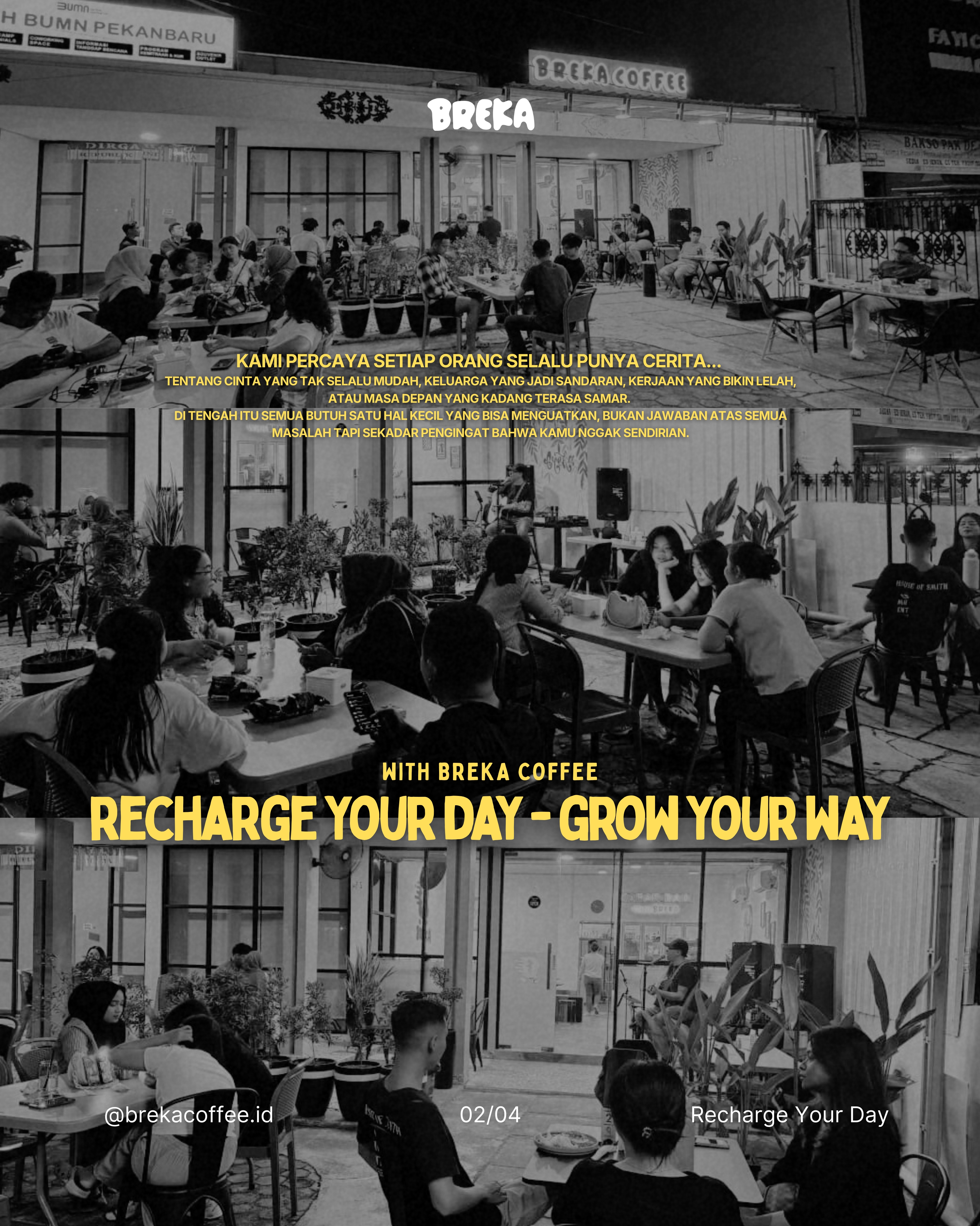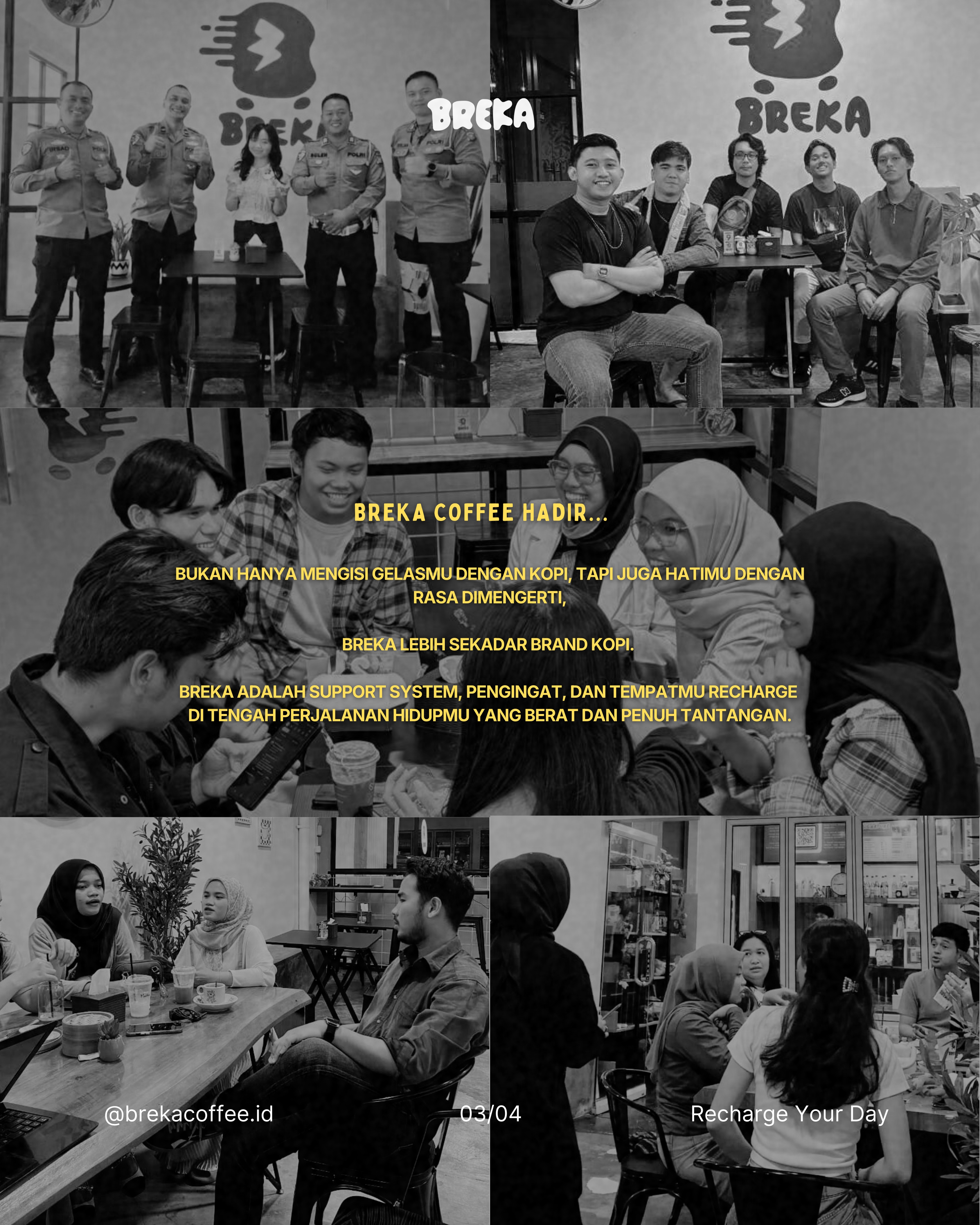 Dan ketika momen penting datang Breka ingin hadir, seperti keluarga atau sahabat yang tak pernah lupa. Karena bagi kami, Breka bukan sekadar brand kopi. Breka adalah support system, pengingat, dan tempatmu recharge di tengah perjalanan hidupmu yang berat dan penuh tantangan.